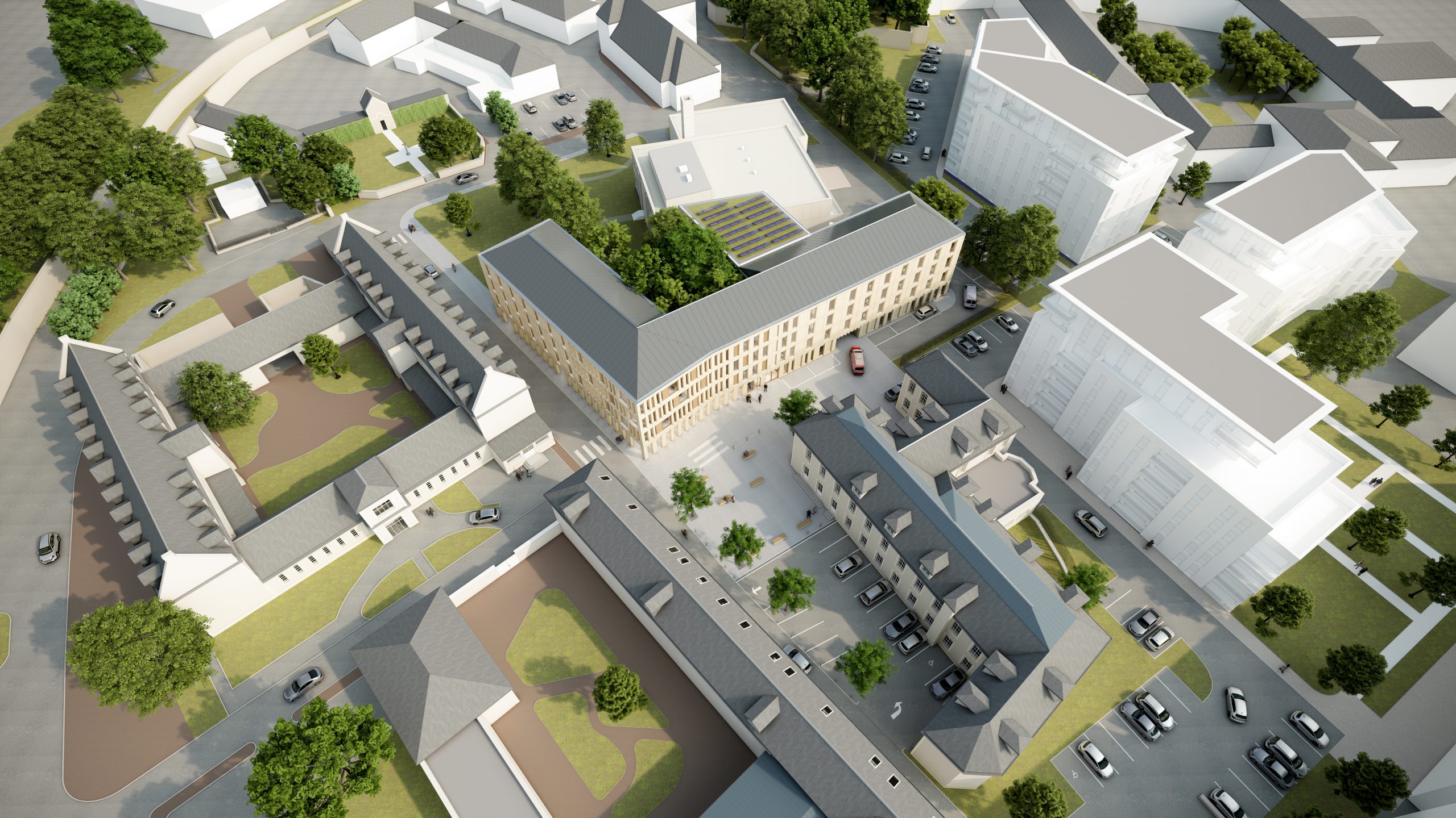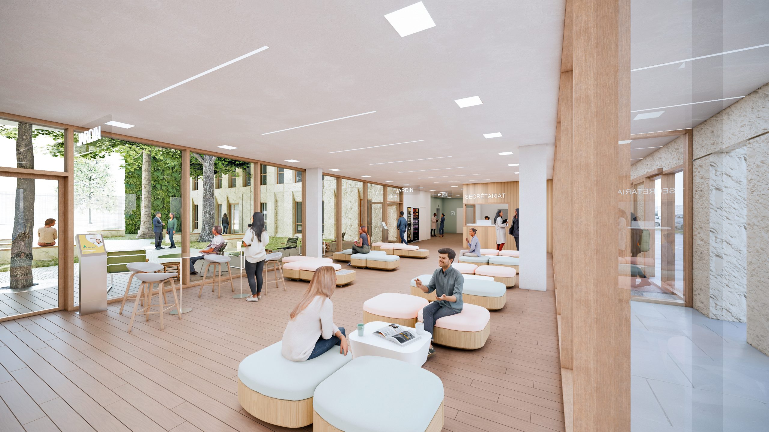Le projet s’implante à l’alignement du terrain sur ses façades nord et est pour libérer un espace central permettant de conserver les magnifiques arbres d’alignement issus de l’histoire du site et qui font toute la qualité de ce lieu situé au cœur du centre hospitalier. Cette masse végétale exceptionnelle constitue une bouffée d’oxygène et de fraîcheur hors du commun pour le bien des patients d’aujourd’hui et de demain ainsi qu’un lieu propice pour un jardin thérapeutique. L’alignement sur les deux rues renforce l’urbanité de la belle placette trapézoïdale située au nord de la parcelle en mettant en scène sa face sud qui accueille alors naturellement l’entrée principale du nouveau bâtiment. La pierre de Caen, matériaugéosourcé pérenne, habille les façades pour une intégration douce tout en développant une écriture architecturale contemporaine.