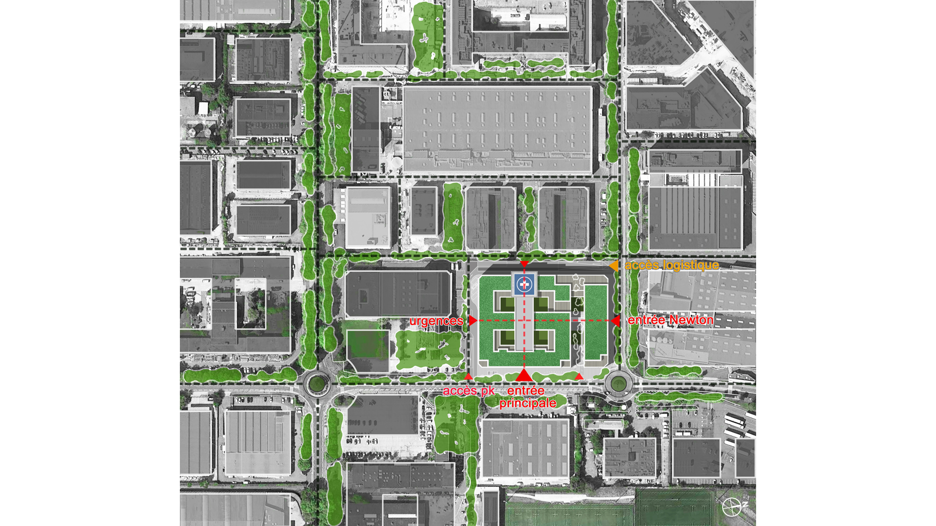 Le choix de réaliser un hôpital qui reprenne les règles d’un ilot urbain constitue un élément fédérateur de la transformation du quartier. Il permet de percevoir l’hôpital comme un équipement partie prenante de la ville, un hôpital proche de ses habitants mais aussi proche des quartiers d’habitation susceptibles d’accueillir le personnel à proximité de l’hôpital.